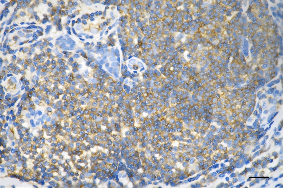 Immunohistochemistry was performed on paraffin-embedded human breast carcinoma using moesin antibody. Antigen retrieval was done in sodium citrate buffer (pH 6.0). DAB was used for detection, with hematoxylin counterstaining. Images were acquired using a Nikon Ci-L Plus microscope (40× objective). Scale bar: 25 μm.