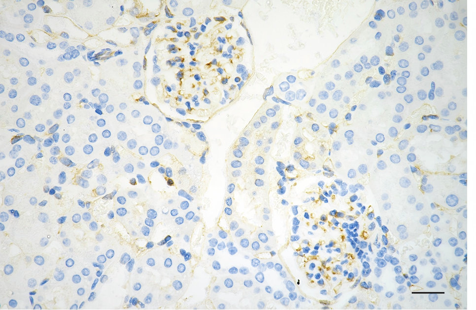 Immunohistochemistry was performed on paraffin-embedded mouse kidney using moesin antibody. Antigen retrieval was done in sodium citrate buffer (pH 6.0). DAB was used for detection, with hematoxylin counterstaining. Images were acquired using a Nikon Ci-L Plus microscope (40× objective). Scale bar: 25 μm.