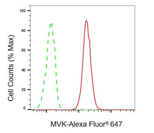 Flow cytometric analysis of MVK expression in HT-1080 cells using MVK antibody. Green, isotype control; red, MVK.