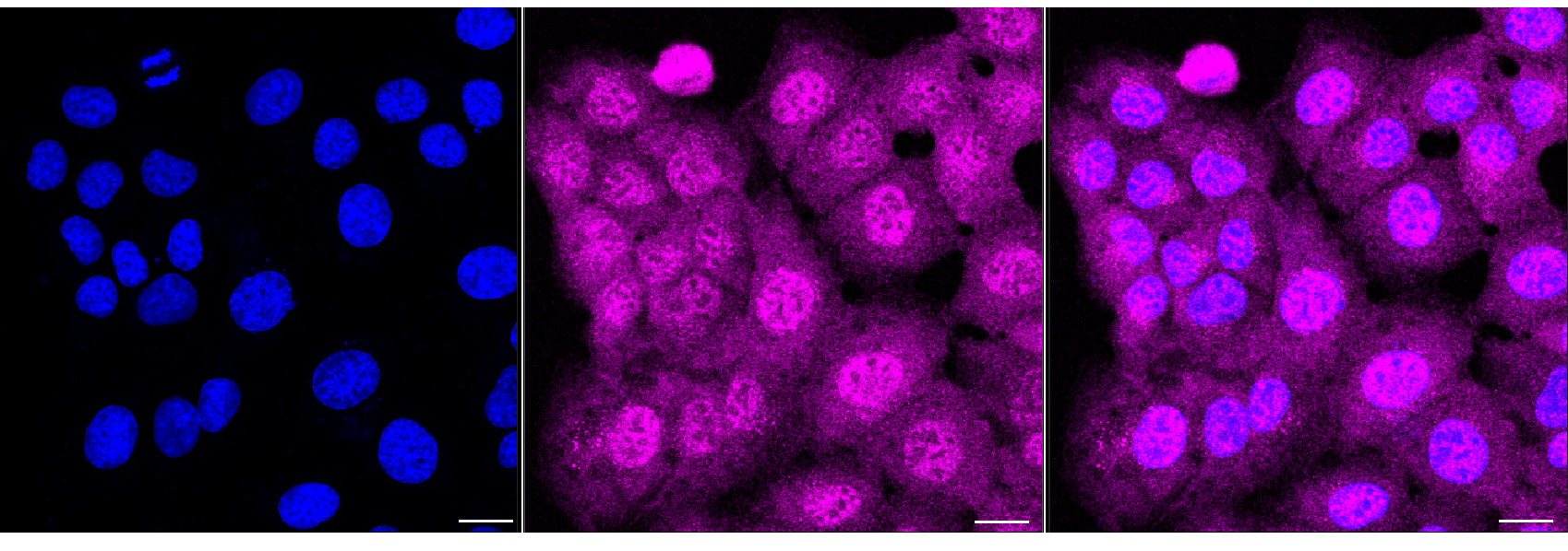 Immunocytochemical staining of HT-1080 cells with MVK antibody. Nuclei were stained blue with DAPI; MVK was stained magenta with Alexa Fluor? 647. Images were taken using Leica stellaris 5. Protein abundance based on laser Intensity and smart gain: Medium. Scale bar, 20 μm.