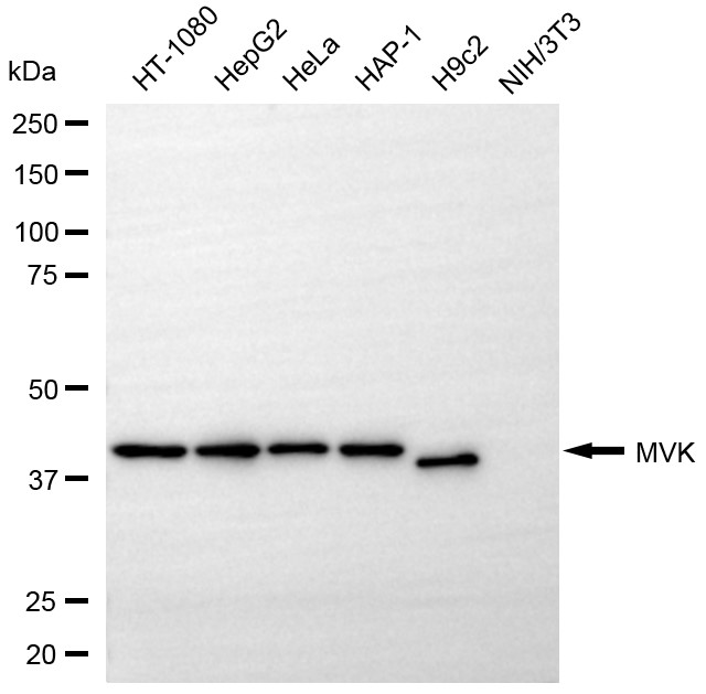 Western blotting analysis using MVK antibody. Total cell lysates (30 μg) from various cell lines were loaded and separated by SDS-PAGE. The blot was incubated with MVK antibody and HRP-conjugated goat anti-rabbit secondary antibody respectively.