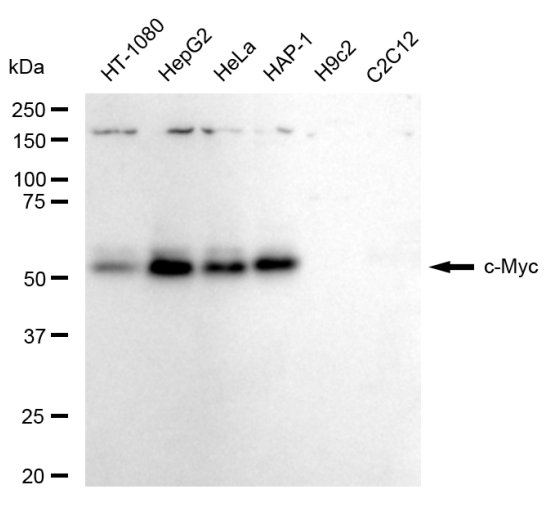 Western blotting analysis using c-Myc antibody. Total cell lysates (30 μg) from various cell lines were loaded and separated by SDS-PAGE. The blot was incubated with c-Myc antibody and HRP-conjugated goat anti-rabbit secondary antibody respectively.