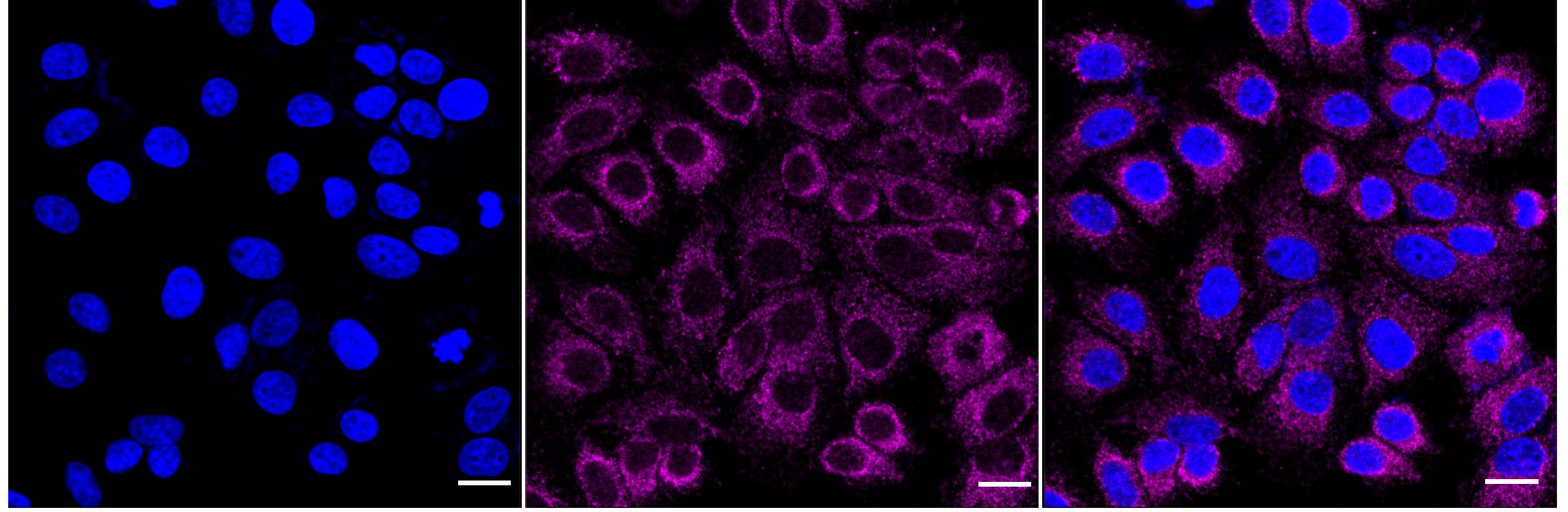 Immunocytochemical staining of HepG2 cells with myosin XIX antibody. Nuclei were stained blue with DAPI; Myosin XIX was stained magenta with Alexa Fluor? 647. Images were taken using Leica stellaris 5. Protein abundance based on laser Intensity and smart gain: Medium. Scale bar: 20 μm.