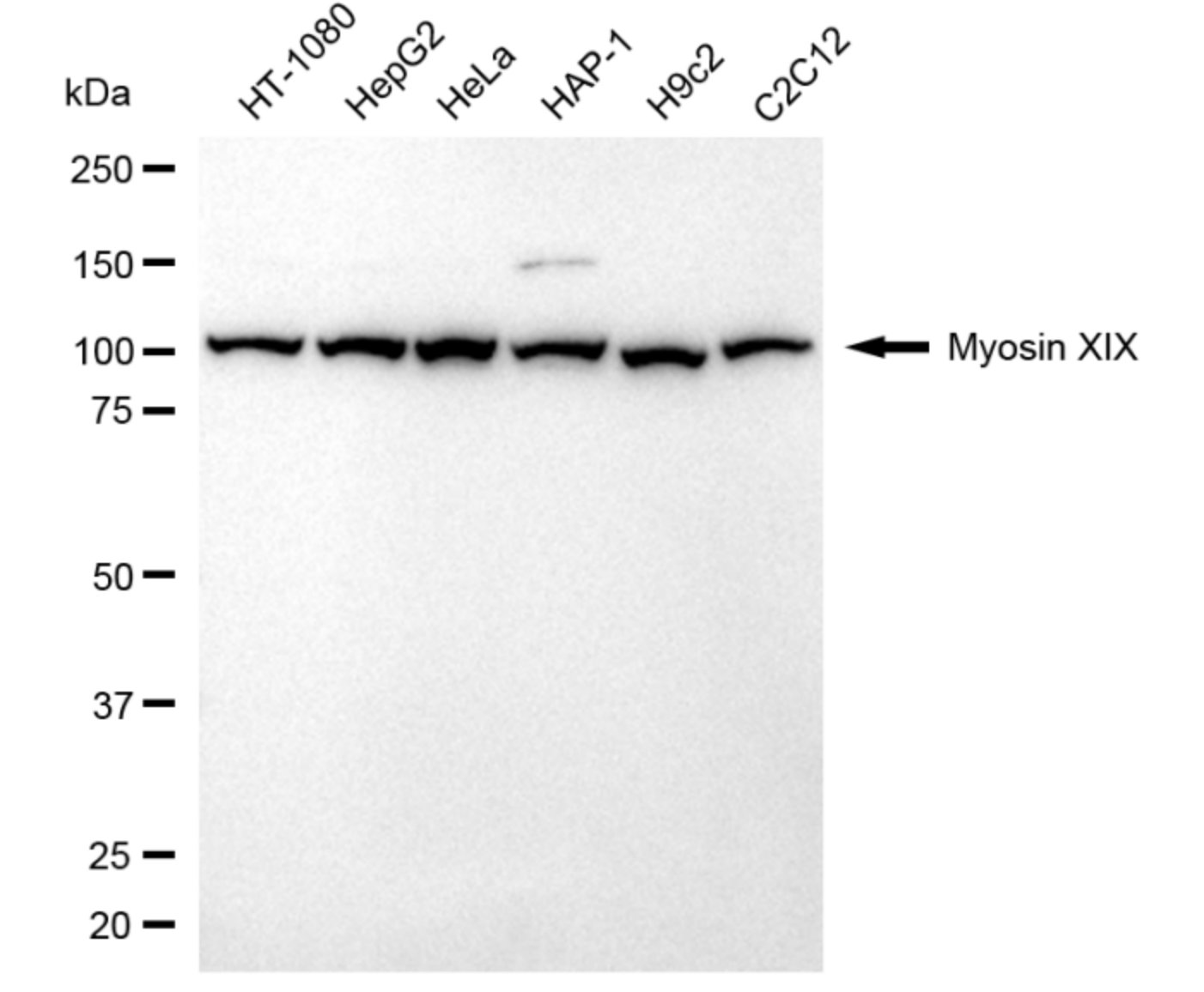 Western blotting analysis using myosin XIX antibody. Total cell lysates (30 μg) from various cell lines were loaded and separated by SDS-PAGE. The blot was incubated with myosin XIX antibody and HRP-conjugated goat anti-rabbit secondary antibody respectively.