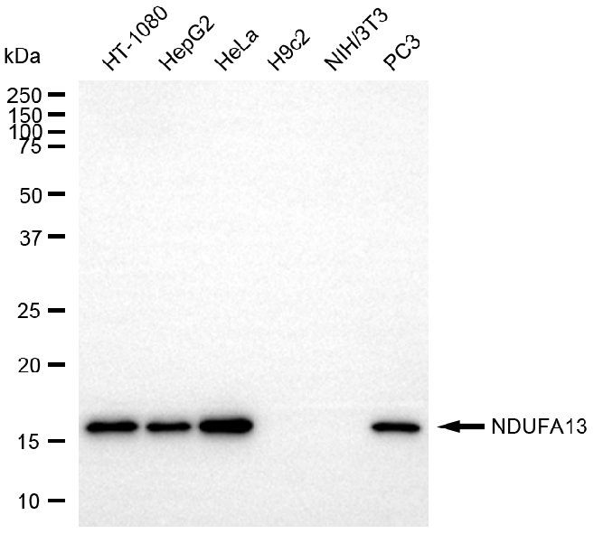Western blotting analysis using NDUFA13 antibody. Total cell lysates (30 μg) from various cell lines were loaded and separated by SDS-PAGE. The blot was incubated with NDUFA13 antibody and HRP-conjugated goat anti-rabbit secondary antibody respectively.