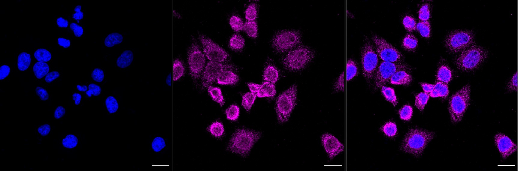 Immunocytochemical staining of HepG2 cells with NDUFS3 antibody. Nuclei were stained blue with DAPI; NDUFS3 was stained magenta with Alexa Fluor? 647. Images were taken using Leica stellaris 5. Protein abundance based on laser Intensity and smart gain: Medium. Scale bar, 20 μm.