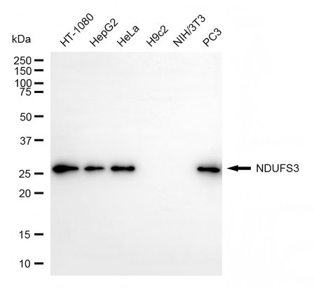 Western blotting analysis using NDUFS3 antibody. Total cell lysates (30 μg) from various cell lines were loaded and separated by SDS-PAGE. The blot was incubated with NDUFS3 antibody and HRP-conjugated goat anti-rabbit secondary antibody respectively.