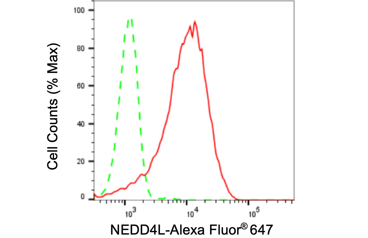 Flow cytometric analysis of NEDD4L expression in HepG2 cells using NEDD4L antibody. Green, isotype control; red, NEDD4L.