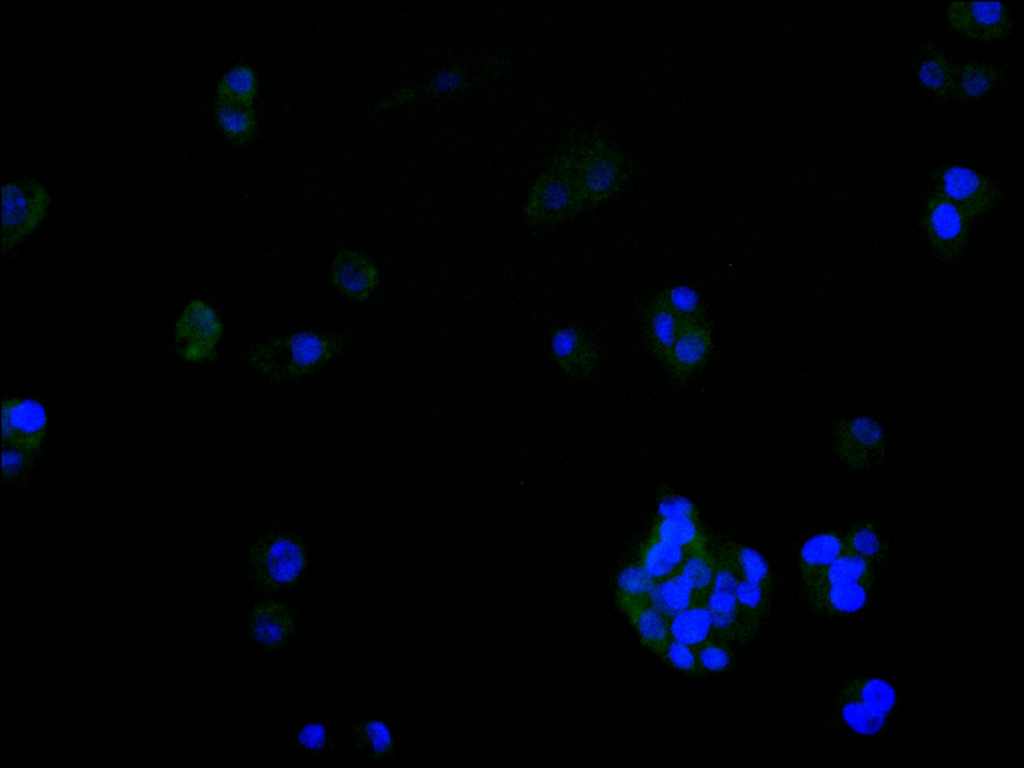 Immunofluorescence staining of HepG2 cell with CSB-RA942071A0HU at 1:50, counter-stained with DAPI. The cells were fixed in 4% formaldehyde, permeabilized using 0.2% Triton X-100 and blocked in 10% normal Goat Serum. The cells were then incubated with the antibody overnight at 4°C. The secondary antibody was Alexa Fluor 488-congugated AffiniPure Goat Anti-Rabbit IgG(H+L).
