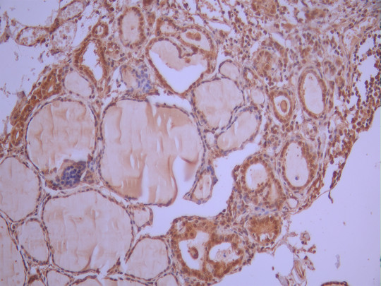 IHC image of CSB-RA102164A0HU diluted at 1:100 and staining in paraffin-embedded human thyroid tissue performed on a Leica BondTM system. After dewaxing and hydration, antigen retrieval was mediated by high pressure in a citrate buffer (pH 6.0). Section was blocked with 10% normal goat serum 30min at RT. Then primary antibody (1% BSA) was incubated at 4°C overnight. The primary is detected by a Goat anti-rabbit polymer IgG labeled by HRP and visualized using 0.05% DAB.