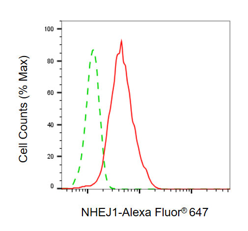 Flow cytometric analysis of NHEJ1 expression in HepG2 cells using NHEJ1 antibody. Green, isotype control; red, NHEJ1.