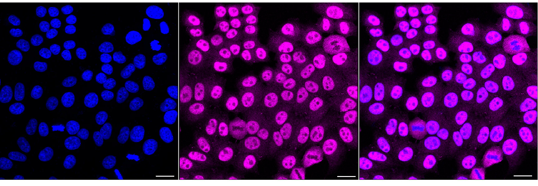 Immunocytochemical staining of HepG2 cells with NHEJ1 antibody. Nuclei were stained blue with DAPI; NHEJ1 was stained magenta with Alexa Fluor? 647. Images were taken using Leica stellaris 5. Protein abundance based on laser Intensity and smart gain: High. Scale bar, 20 μm.