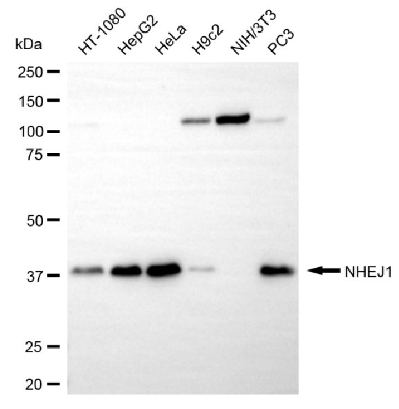 Western blotting analysis using NHEJ1 antibody. Total cell lysates (30 μg) from various cell lines were loaded and separated by SDS-PAGE. The blot was incubated with NHEJ1 antibody and HRP-conjugated goat anti-rabbit secondary antibody respectively.