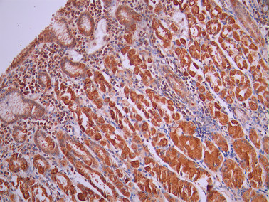 IHC image of CSB-RA943053A0HU diluted at 1:100 and staining in paraffin-embedded human stomach tissue performed on a Leica BondTM system. After dewaxing and hydration, antigen retrieval was mediated by high pressure in a citrate buffer (pH 6.0). Section was blocked with 10% normal goat serum 30min at RT. Then primary antibody (1% BSA) was incubated at 4°C overnight. The primary is detected by a Goat anti-rabbit polymer IgG labeled by HRP and visualized using 0.05% DAB.