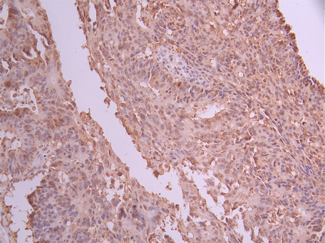 IHC image of CSB-RA060362A0HU diluted at 1:100 and staining in paraffin-embedded human colorectal cancer performed on a Leica BondTM system. After dewaxing and hydration, antigen retrieval was mediated by high pressure in a citrate buffer (pH 6.0). Section was blocked with 10% normal goat serum 30min at RT. Then primary antibody (1% BSA) was incubated at 4°C overnight. The primary is detected by a Goat anti-rabbit polymer IgG labeled by HRP and visualized using 0.05% DAB.