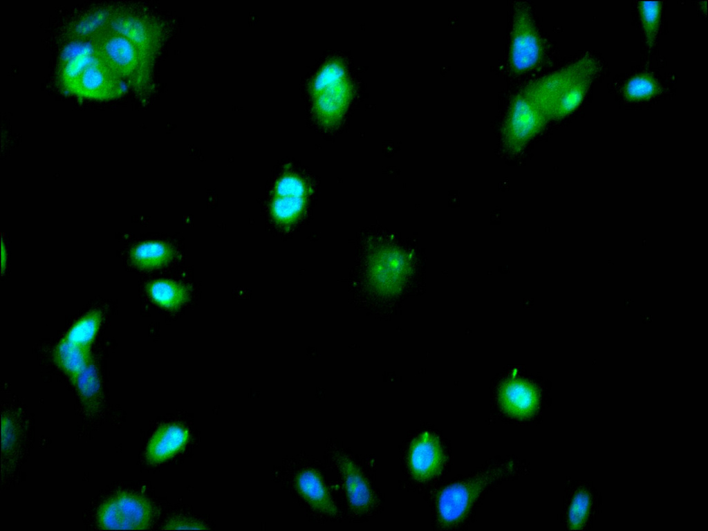 Immunofluorescence staining of MCF-7 cell with CSB-RA564743A0HU at 1:50, counter-stained with DAPI. The cells were fixed in 4% formaldehyde, permeabilized using 0.2% Triton X-100 and blocked in 10% normal Goat Serum. The cells were then incubated with the antibody overnight at 4°C. The secondary antibody was Alexa Fluor 488-congugated AffiniPure Goat Anti-Rabbit IgG(H+L).
