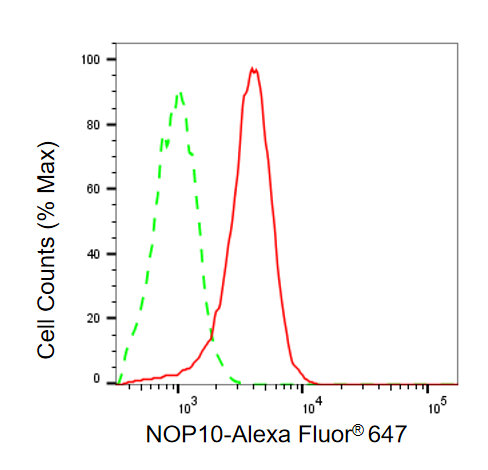 Flow cytometric analysis of NOP10 expression in HepG2 cells using NOP10 antibody. Green, isotype control; red, NOP10.