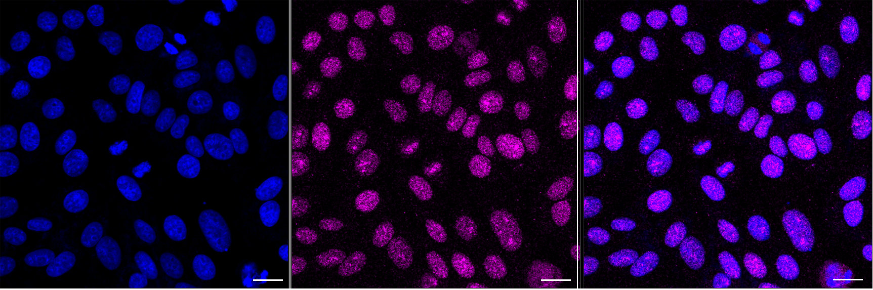 Immunocytochemical staining of HepG2 cells with NOP10 antibody. Nuclei were stained blue with DAPI; NOP10 was stained magenta with Alexa Fluor? 647. Images were taken using Leica stellaris 5. Protein abundance based on laser Intensity and smart gain: Medium. Scale bar, 20 μm.