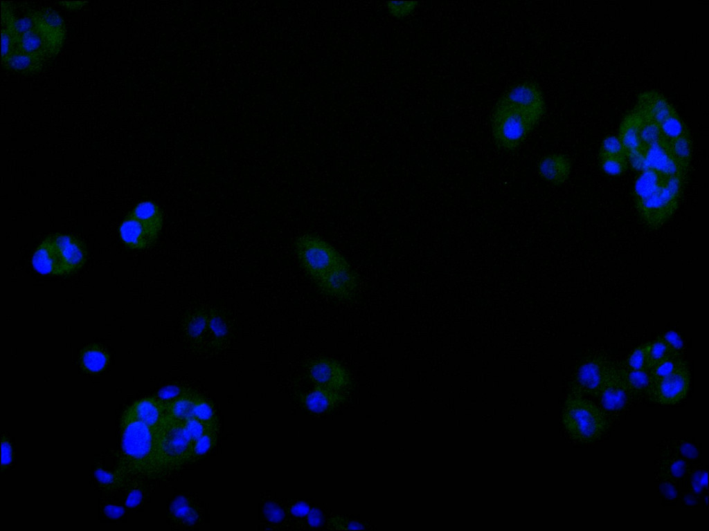 Immunofluorescence staining of HepG2 cell with CSB-RA947279A0HU at 1:50, counter-stained with DAPI. The cells were fixed in 4% formaldehyde, permeabilized using 0.2% Triton X-100 and blocked in 10% normal Goat Serum. The cells were then incubated with the antibody overnight at 4°C. The secondary antibody was Alexa Fluor 488-congugated AffiniPure Goat Anti-Rabbit IgG(H+L).