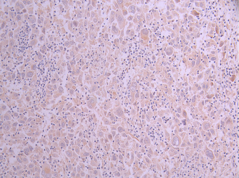 IHC image of CSB-RA947279A0HU diluted at 1:100 and staining in paraffin-embedded human liver cancer performed on a Leica BondTM system. After dewaxing and hydration, antigen retrieval was mediated by high pressure in a citrate buffer (pH 6.0). Section was blocked with 10% normal goat serum 30min at RT. Then primary antibody (1% BSA) was incubated at 4°C overnight. The primary is detected by a Goat anti-rabbit polymer IgG labeled by HRP and visualized using 0.05% DAB.