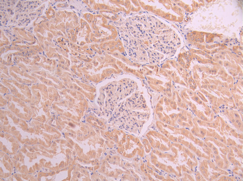 IHC image of CSB-RA947279A0HU diluted at 1:100 and staining in paraffin-embedded human kidney tissue performed on a Leica BondTM system. After dewaxing and hydration, antigen retrieval was mediated by high pressure in a citrate buffer (pH 6.0). Section was blocked with 10% normal goat serum 30min at RT. Then primary antibody (1% BSA) was incubated at 4°C overnight. The primary is detected by a Goat anti-rabbit polymer IgG labeled by HRP and visualized using 0.05% DAB.