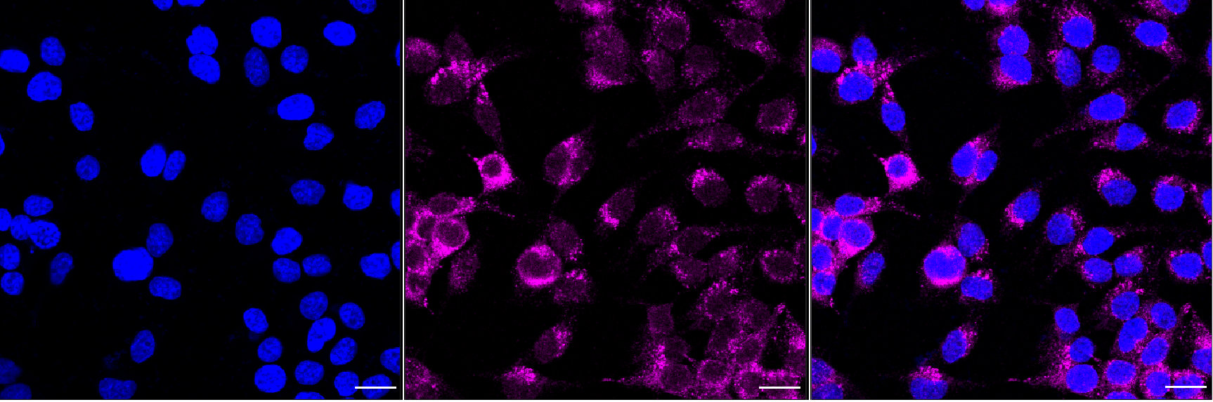 Immunocytochemical staining of HeLa cells with NSDHL antibody. Nuclei were stained blue with DAPI; NSDHL was stained magenta with Alexa Fluor? 647. Images were taken using Leica stellaris 5. Protein abundance based on laser Intensity and smart gain: Medium. Scale bar, 20 μm.