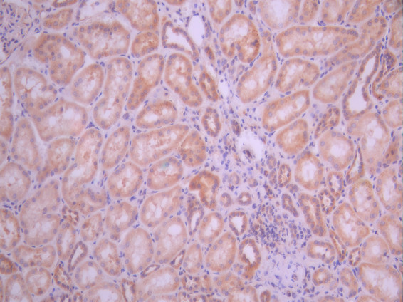 IHC image of CSB-RA048395A0HU diluted at 1:100 and staining in paraffin-embedded human kidney tissue performed on a Leica BondTM system. After dewaxing and hydration, antigen retrieval was mediated by high pressure in a citrate buffer (pH 6.0). Section was blocked with 10% normal goat serum 30min at RT. Then primary antibody (1% BSA) was incubated at 4°C overnight. The primary is detected by a Goat anti-rabbit polymer IgG labeled by HRP and visualized using 0.05% DAB.