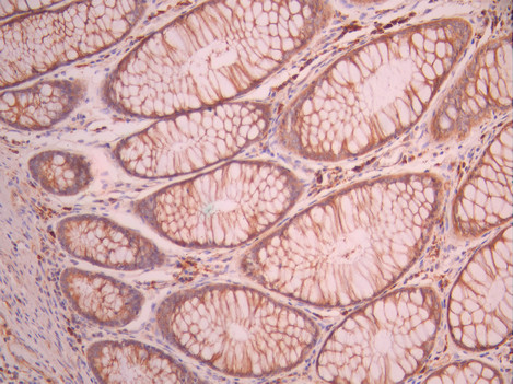 IHC image of CSB-RA048395A0HU diluted at 1:100 and staining in paraffin-embedded human colorectal cancer performed on a Leica BondTM system. After dewaxing and hydration, antigen retrieval was mediated by high pressure in a citrate buffer (pH 6.0). Section was blocked with 10% normal goat serum 30min at RT. Then primary antibody (1% BSA) was incubated at 4°C overnight. The primary is detected by a Goat anti-rabbit polymer IgG labeled by HRP and visualized using 0.05% DAB.