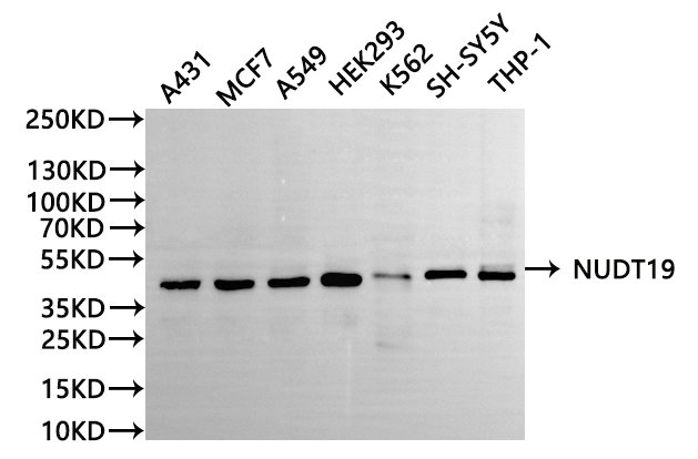 Positive WB detected in: A431 whole cell lysate(30μg), MCF-7 whole cell lysate(30μg), A549 whole cell lysate(30μg), HEK293 whole cell lysate(30μg), K562 whole cell lysate(30μg), SH-SY5Y whole cell lysate(30μg), THP-1 whole cell lysate(30μg)