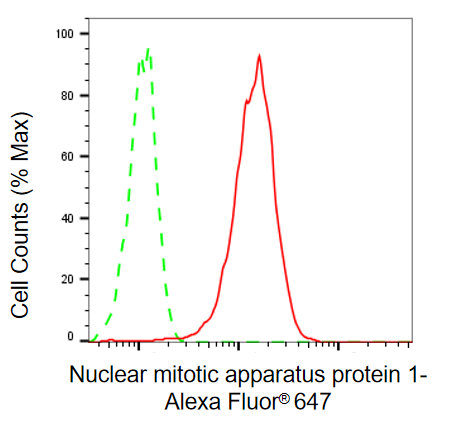 Flow cytometric analysis of nuclear mitotic apparatus protein 1 expression in HepG2 cells using nuclear mitotic apparatus protein 1 antibody. Green, isotype control; red, nuclear mitotic apparatus protein 1.