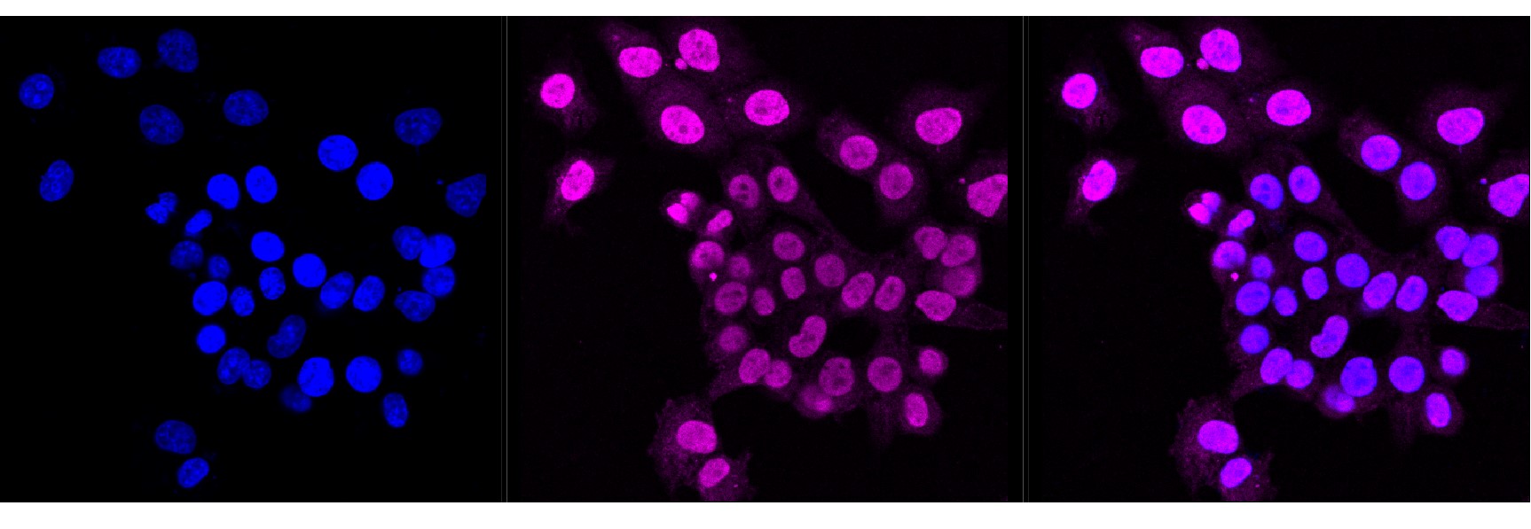 Immunocytochemical staining of HepG2 cells with Nuclear mitotic apparatus protein 1 antibody. Nuclei were stained blue with DAPI; Nuclear mitotic apparatus protein 1 was stained magenta with Alexa Fluor? 647. Images were taken using Leica stellaris 5. Protein abundance based on laser Intensity and smart gain: High. Scale bar, 20 μm.