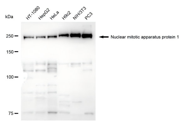 Western blotting analysis using nuclear mitotic apparatus protein 1 antibody. Total cell lysates (30 μg) from various cell lines were loaded and separated by SDS-PAGE. The blot was incubated with nuclear mitotic apparatus protein 1 antibody and HRP-conjugated goat anti-rabbit secondary antibody respectively.