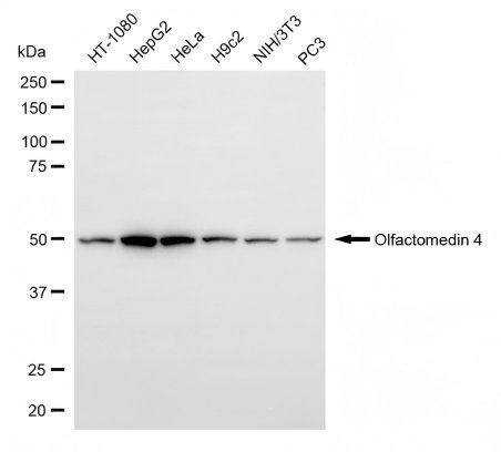 Western blotting analysis using olfactomedin 4 antibody. Total cell lysates (30 μg) from various cell lines were loaded and separated by SDS-PAGE. The blot was incubated with olfactomedin 4 antibody and HRP-conjugated goat anti-rabbit secondary antibody respectively.
