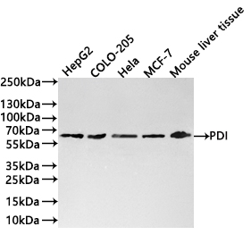 Positive WB detected in: HepG2 whole cell lysate(30μg), COLO-205 whole cell lysate(30μg), Hela whole cell lysate(30μg), MCF-7 whole cell lysate(30μg), Mouse liver tissue lysate(30μg)