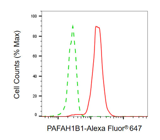 Flow cytometric analysis of PAFAH1B1 expression in HepG2 cells using PAFAH1B1 antibody. Green, isotype control; red, PAFAH1B1.