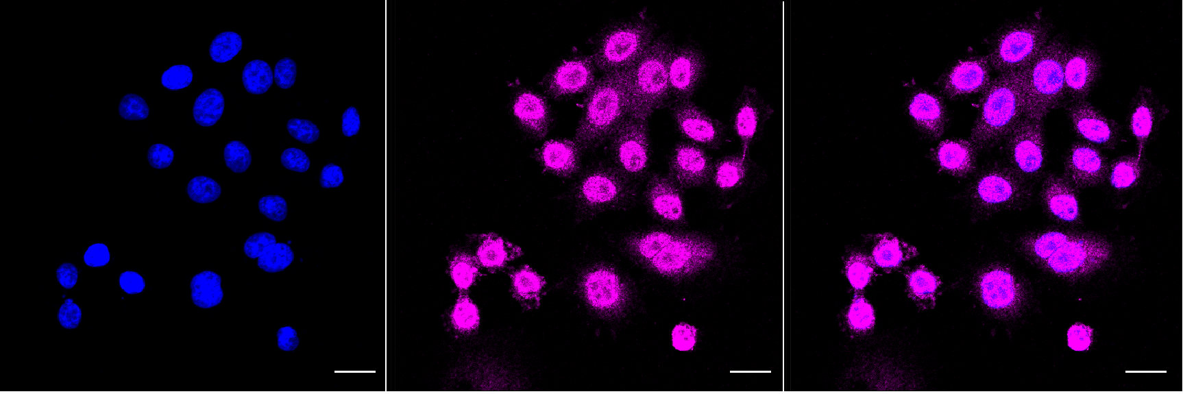Immunocytochemical staining of HepG2 cells with PAFAH1B1 antibody. Nuclei were stained blue with DAPI; PAFAH1B1 was stained magenta with Alexa Fluor? 647. Images were taken using Leica stellaris 5. Protein abundance based on laser Intensity and smart gain: Medium. Scale bar, 20 μm.