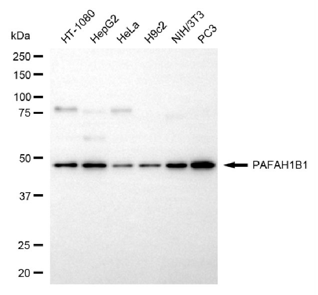 Western blotting analysis using PAFAH1B1 antibody. Total cell lysates (30 μg) from various cell lines were loaded and separated by SDS-PAGE. The blot was incubated with PAFAH1B1 antibody and HRP-conjugated goat anti-rabbit secondary antibody respectively.