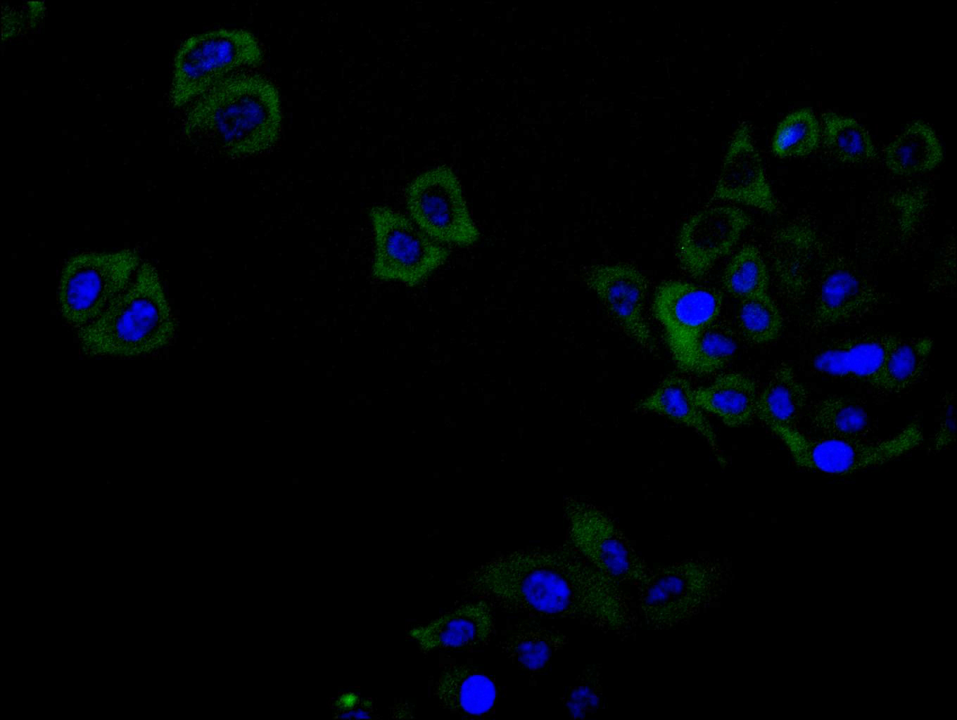 Immunofluorescence staining of Hela cell with CSB-RA565696A0HU at 1:50, counter-stained with DAPI. The cells were fixed in 4% formaldehyde and blocked in 10% normal Goat Serum. The cells were then incubated with the antibody overnight at 4°C. The secondary antibody was Alexa Fluor 488-congugated AffiniPure Goat Anti-Rabbit IgG(H+L).
