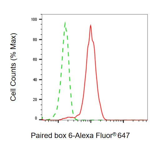 Flow cytometric analysis of Paired box 6 expression in HeLa cells using Paired box 6 antibody. Green, isotype control; red, Paired box 6.