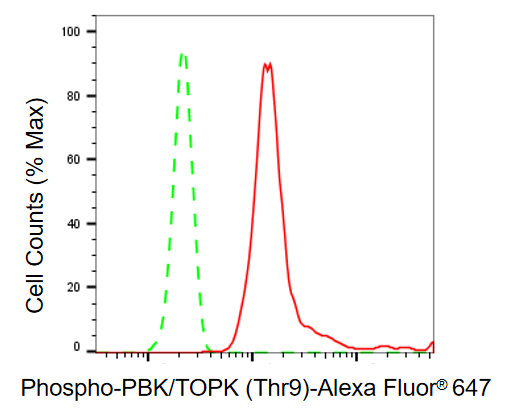 Flow cytometric analysis of phospho-PBK/TOPK (Thr9) expression in HepG2 cells using phospho-PBK/TOPK (Thr9) antibody. Green, isotype control; red, phospho-PBK/TOPK (Thr9).