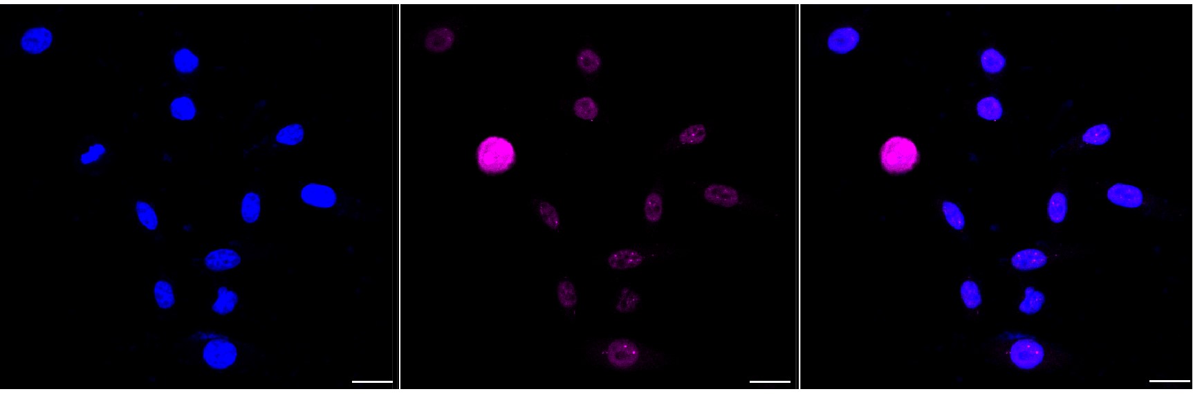 Immunocytochemical staining of Hela cells with Phospho-PBK/TOPK (Thr9) antibody. Nuclei were stained blue with DAPI; Phospho-PBK/TOPK (Thr9) was stained magenta with Alexa Fluor? 647. Images were taken using Leica stellaris 5. Protein abundance based on laser Intensity and smart gain: High. Scale bar, 20 μm.