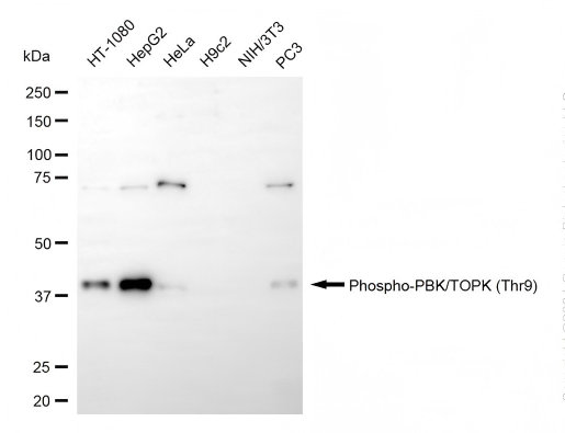Western blotting analysis using phospho-PBK/TOPK (Thr9) antibody. Total cell lysates (30 μg) from various cell lines were loaded and separated by SDS-PAGE. The blot was incubated with phospho-PBK/TOPK (Thr9) antibody and HRP-conjugated goat anti-rabbit secondary antibody respectively.