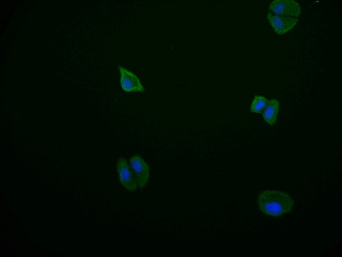 Immunofluorescence staining of HepG2 cell with CSB-RA150831A0HU at 1:50, counter-stained with DAPI. The cells were fixed in 4% formaldehyde and blocked in 10% normal Goat Serum. The cells were then incubated with the antibody overnight at 4°C. The secondary antibody was Alexa Fluor 569-congugated AffiniPure Goat Anti-Rabbit IgG(H+L).