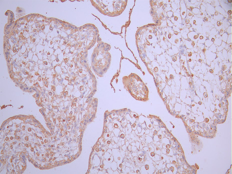 IHC image of CSB-RA017713MA1HU diluted at 1:50 and staining in paraffin-embedded human placenta tissue performed on a Leica BondTM system. After dewaxing and hydration, antigen retrieval was mediated by high pressure in a citrate buffer (pH 6.0). Section was blocked with 10% normal goat serum 30min at RT. Then primary antibody (1% BSA) was incubated at 4°C overnight. The primary is detected by a Anti-Human lgG, Fcy Fragment Specific labeled by HRP and visualized using 0.05% DAB.