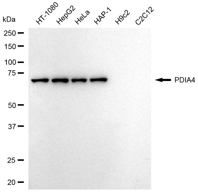 Western blotting analysis using PDIA4 antibody. Total cell lysates (30 μg) from various cell lines were loaded and separated by SDS-PAGE. The blot was incubated with PDIA4 antibody and HRP-conjugated goat anti-rabbit secondary antibody respectively.