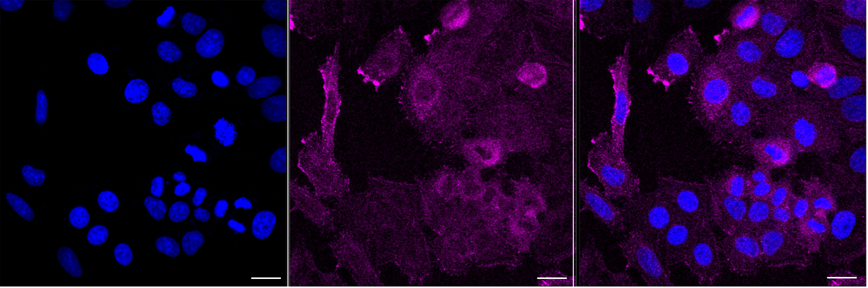 Immunocytochemical staining of HepG2 cells with PDLIM7 antibody. Nuclei were stained blue with DAPI; PDLIM7 was stained magenta with Alexa Fluor? 647. Images were taken using Leica stellaris 5. Protein abundance based on laser Intensity and smart gain: Medium. Scale bar, 20 μm.