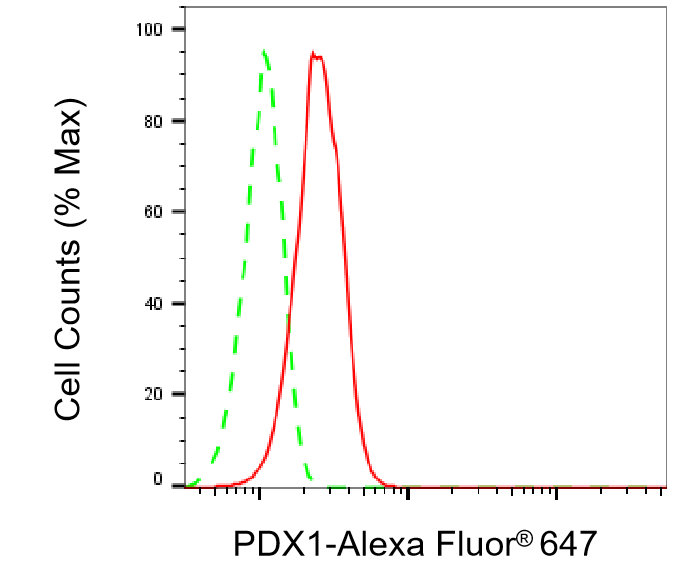 Flow cytometric analysis of PDX1 expression in HeLa cells using PDX1 antibody. Green, isotype control; red, PDX1.