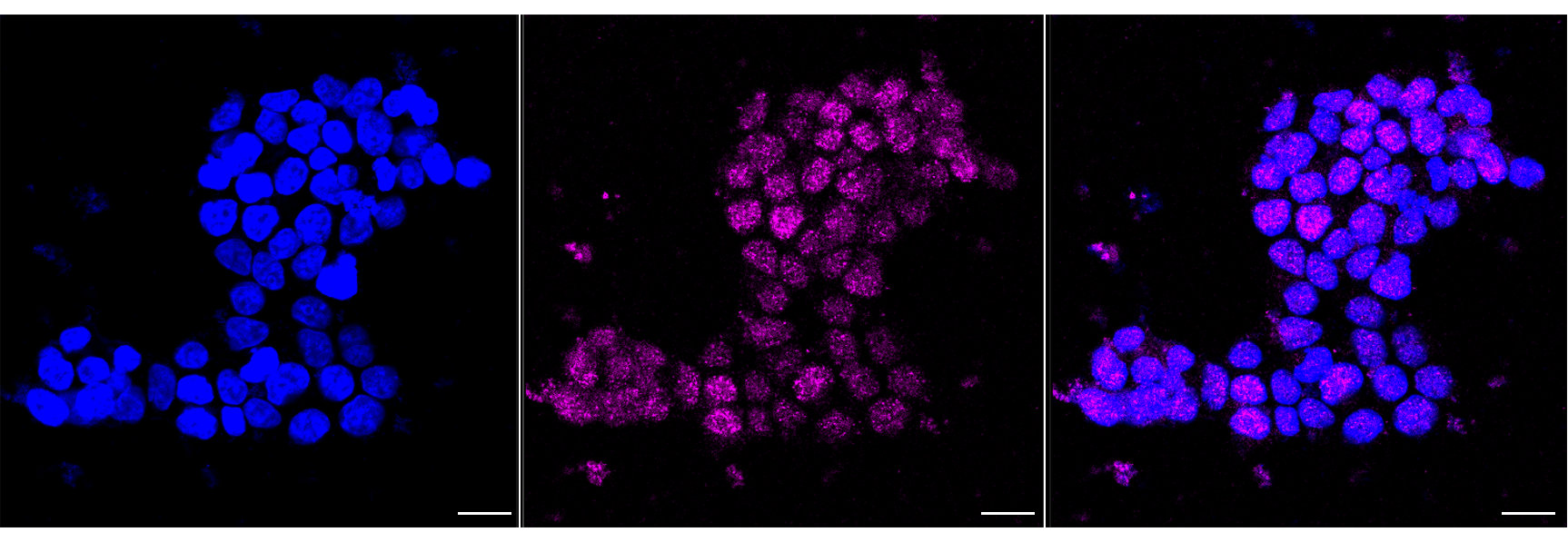 Immunocytochemical staining of Hela cells with PDX1 antibody. Nuclei were stained blue with DAPI; PDX1 was stained magenta with Alexa Fluor? 647. Images were taken using Leica stellaris 5. Protein abundance based on laser Intensity and smart gain: Low. Scale bar, 20 μm.