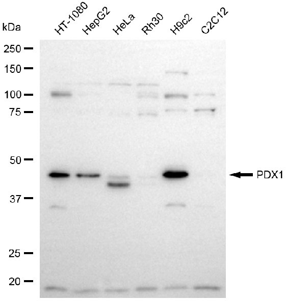 Western blotting analysis using PDX1 antibody. Total cell lysates (30 μg) from various cell lines were loaded and separated by SDS-PAGE. The blot was incubated with PDX1 antibody and HRP-conjugated goat anti-rabbit secondary antibody respectively.