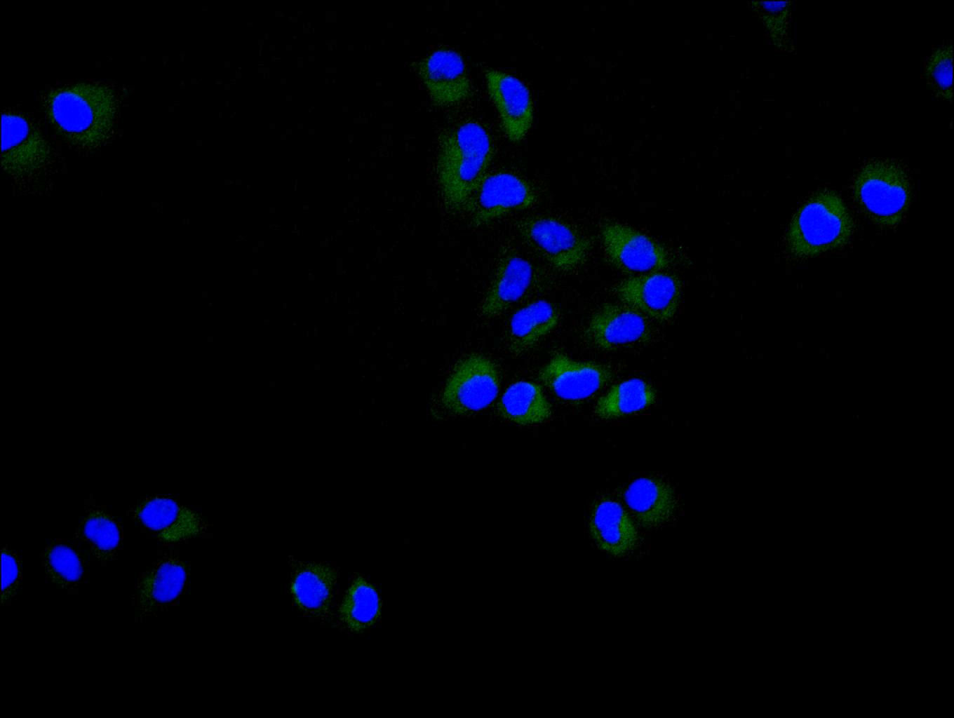 Immunofluorescence staining of Hela cell with CSB-RA695137A0HU at 1:50, counter-stained with DAPI. The cells were fixed in 4% formaldehyde and blocked in 10% normal Goat Serum. The cells were then incubated with the antibody overnight at 4°C. The secondary antibody was Alexa Fluor 488-congugated AffiniPure Goat Anti-Rabbit IgG(H+L).